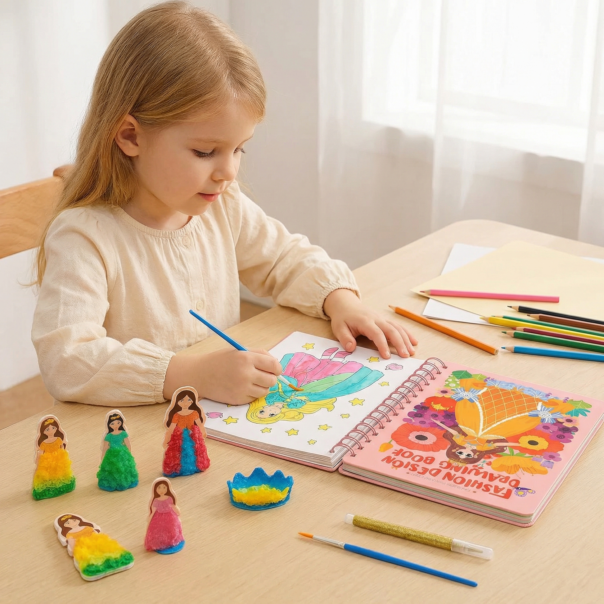 That’s where this unique Princess Fashion Design Drawing and Craft Book shines. Children get to style charming characters by designing outfits, adding textures, stickers, and layered materials to bring their ideas to life. Every page becomes a hands-on fashion project that transforms simple drawing into exciting 3D creations.
